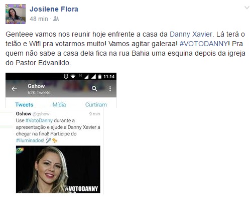 De acordo com a postagem de Josilene, familiares e amigos estarão reunidos na casa de Danny Xavier, em Solânea, torcendo e votando na cantora. #VOTODANNY